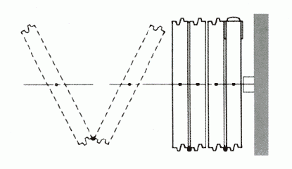 The panels run along the main line of track and turn perpendicular to the track with both trolleys off the centreline of the head track and stacking into a formed pocket or stacking bay.